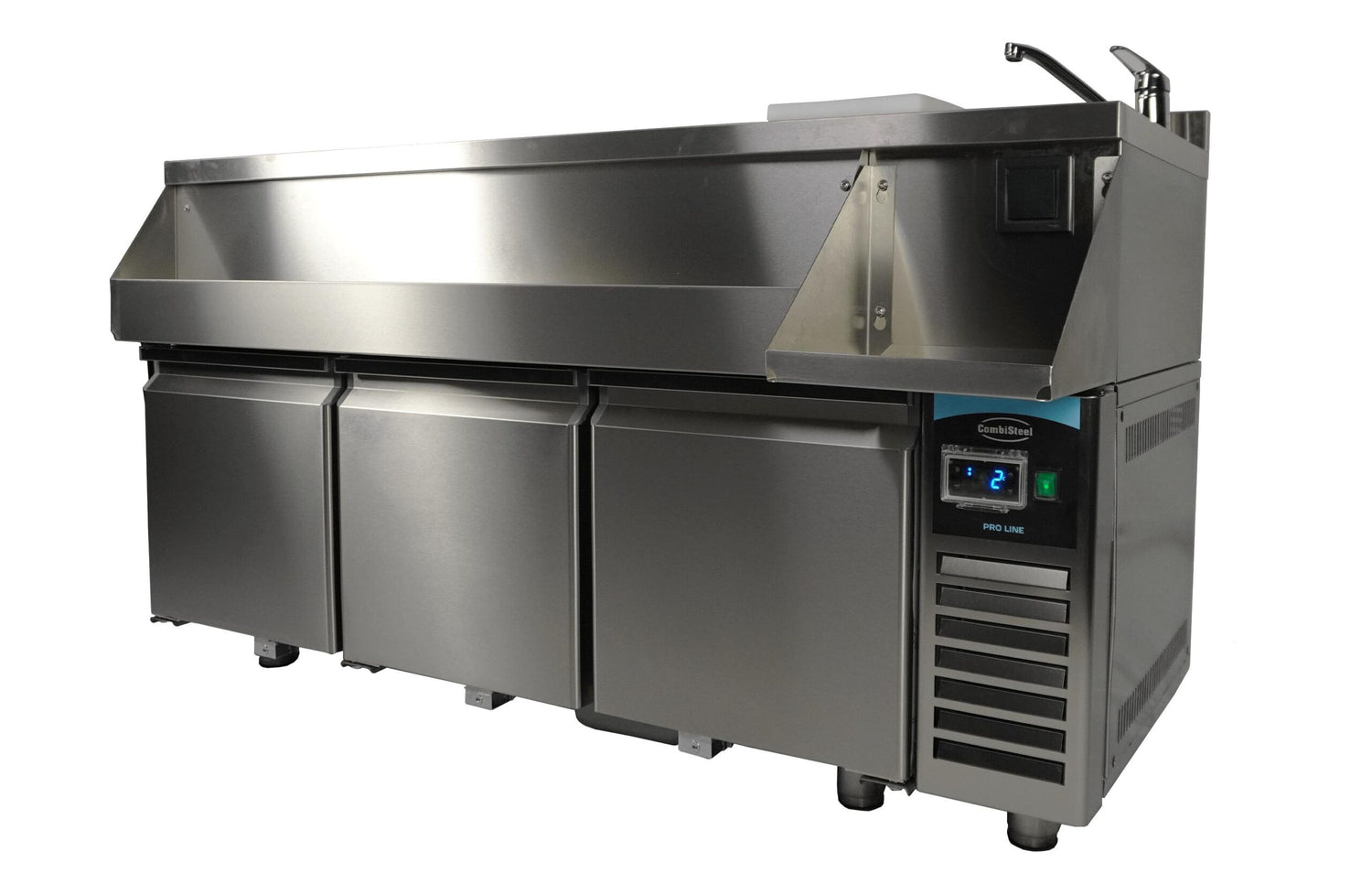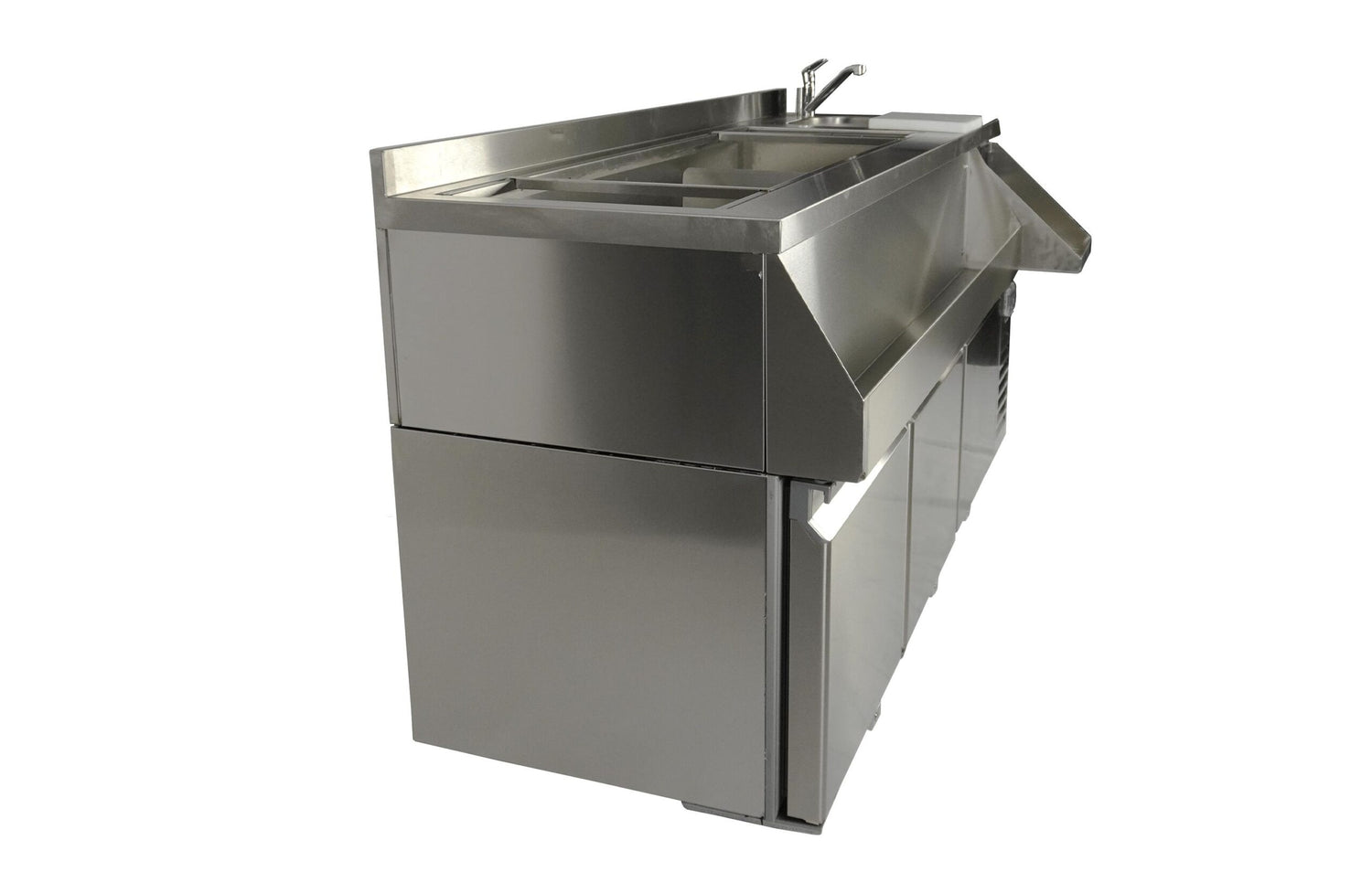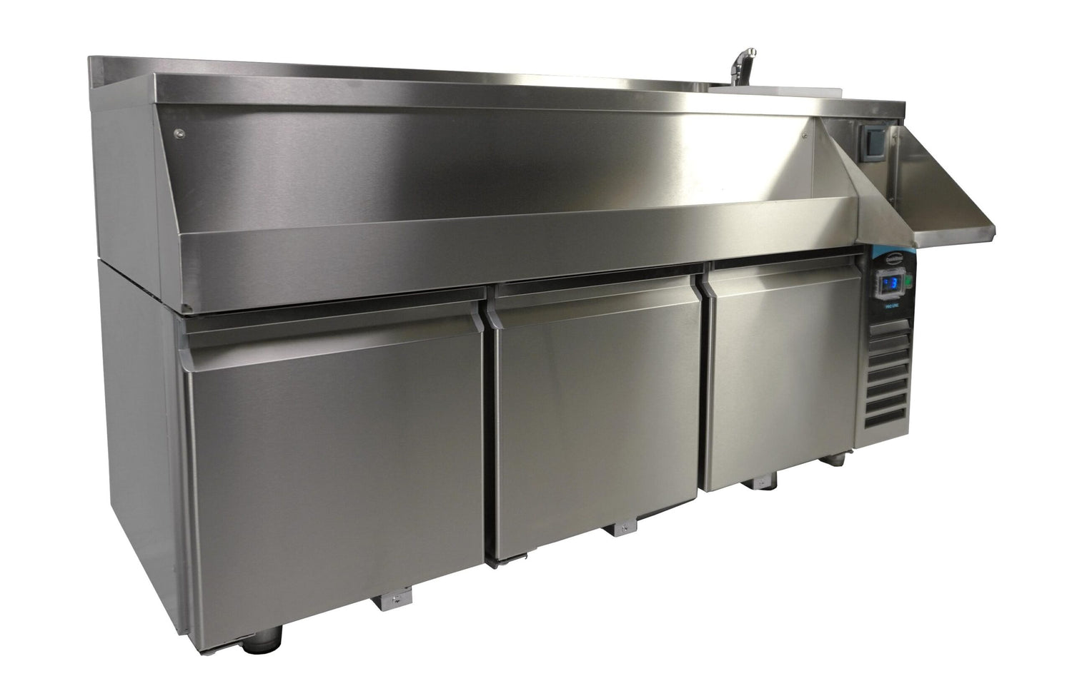The Refrigerated Counter with 3 Doors and Cocktail Bar Station is a versatile and robust solution designed for professional kitchens and bar setups. Made from durable stainless steel, this unit integrates a cocktail bar station with a refrigerated counter to maximize functionality in limited spaces. Equipped with essential features such as a faucet, sink, glass rinser, and a designated blender shelf with a power outlet, this unit is ideal for cocktail preparation and storage of chilled ingredients.