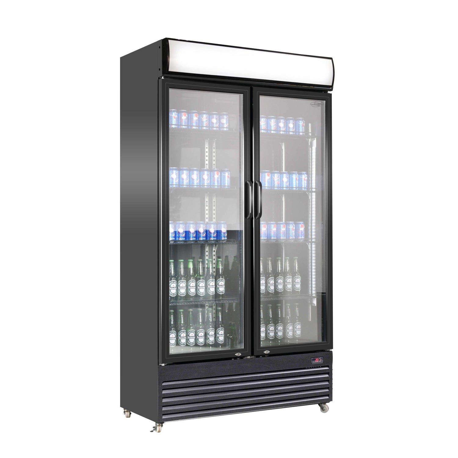 Designed for convenience and mobility, this refrigerator features LED lighting, a built-in lightbox for branding, and heavy-duty wheels for easy movement. With a sleek black finish, it blends seamlessly into modern commercial spaces while offering ample storage capacity.