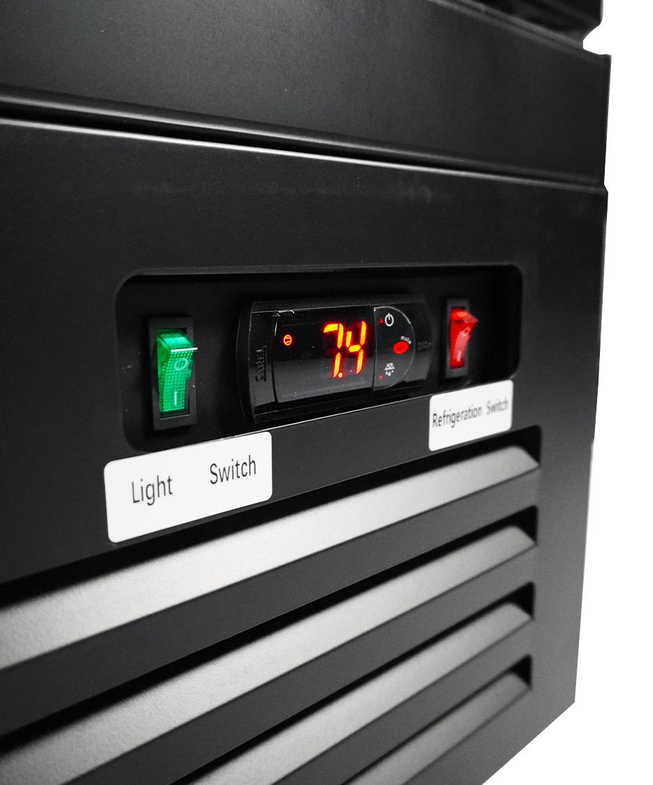 This black refrigerator features a modern design, self-closing doors, adjustable shelves, and a digital temperature display. The ventilated cooling system ensures efficient refrigeration, while automatic defrost minimizes maintenance. LED lighting optimally illuminates your products, and the heated doors prevent condensation, which can be easily turned on or off. Dimensions: 1880x705x2050mm (LxDxH) - power consumption 1.08 kW - capacity 1600 liters - temp. 0/+10ºC - weight 245 kg.